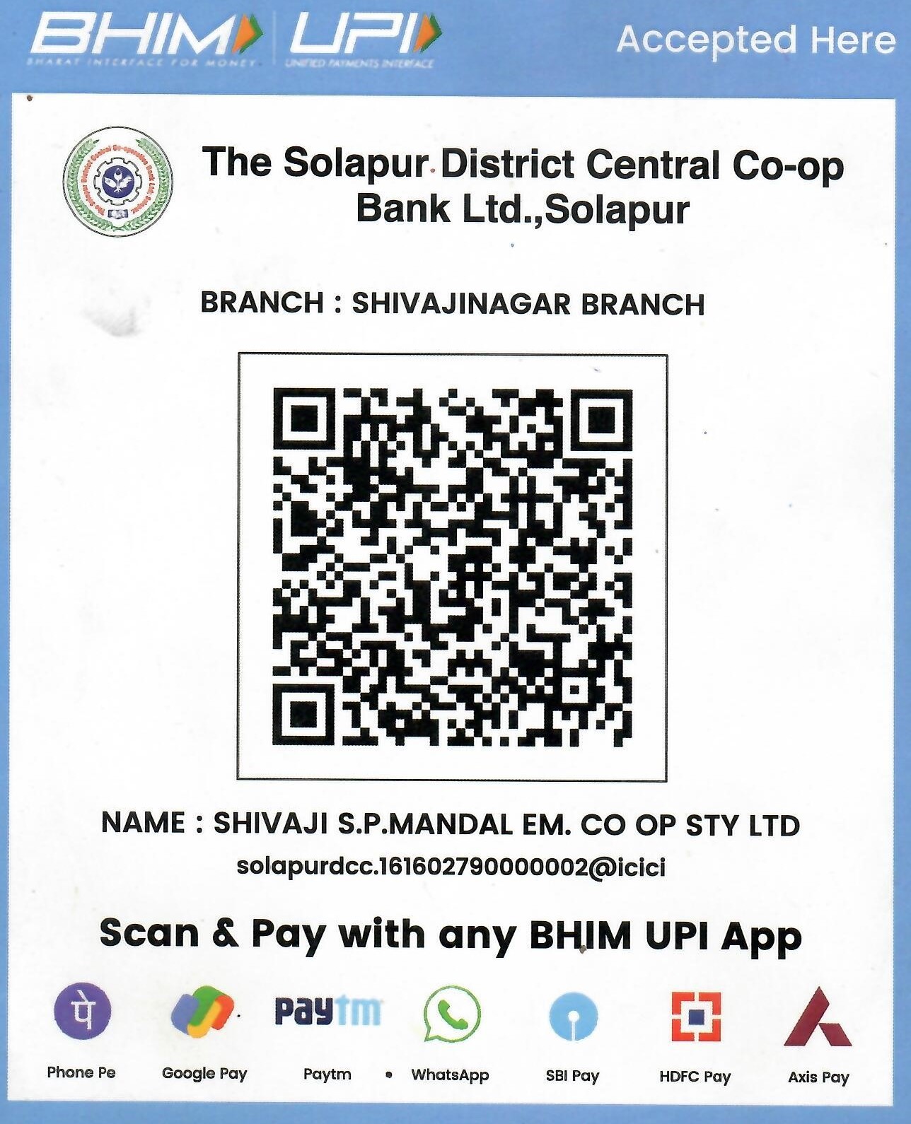 | क्यु आर कोड (QR Code) स्कॅन झाल्या नंतर संस्थेचे नांव SHIVAJI SPMANDAL EM CO OP STY LTD solapurdcc.161602790000002@icici असे आहे याची खात्री करा |